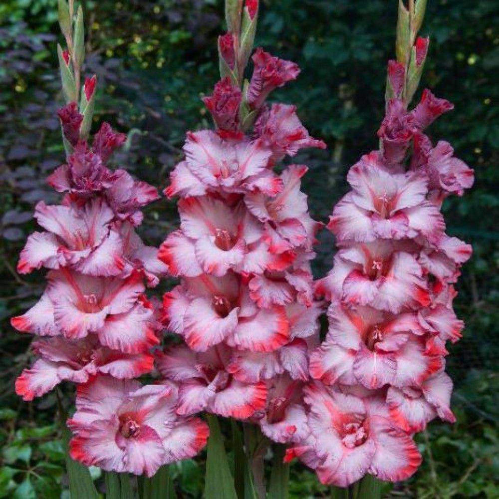 Луковица гладиолуса Тедс Трамп (Teds Trump) представляет собой великолепный сорт с крупными двуцветными цветками. Внутренние лепестки окрашены в кремово-бежевый оттенок с малиновыми росчерками и волнистыми краями, а внешние лепестки ярко малиновые с легкими кремовыми штрихами. На одном колосовидном соцветии одновременно распускается до 9 цветков, а общее количество бутонов может превышать 25. Цветение продолжается около четырех недель, а в срезанном виде цветы сохраняют свежесть до двух недель. Прочные и прямостоячие цветоносы не изгибаются под тяжестью крупных соцветий, а в холодильных камерах срезанные цветы могут храниться до пяти недель.